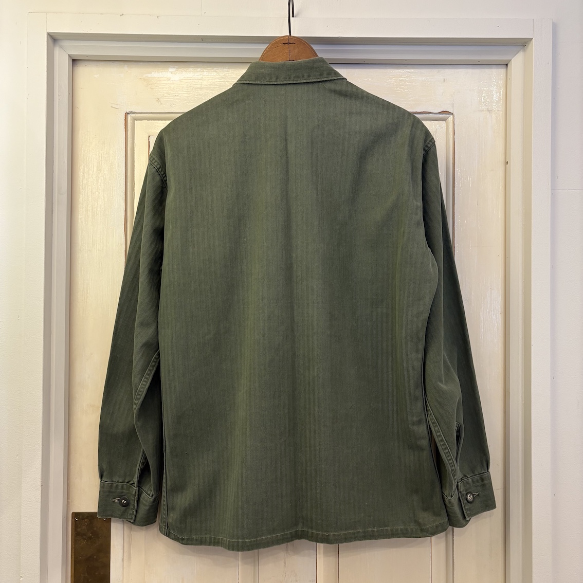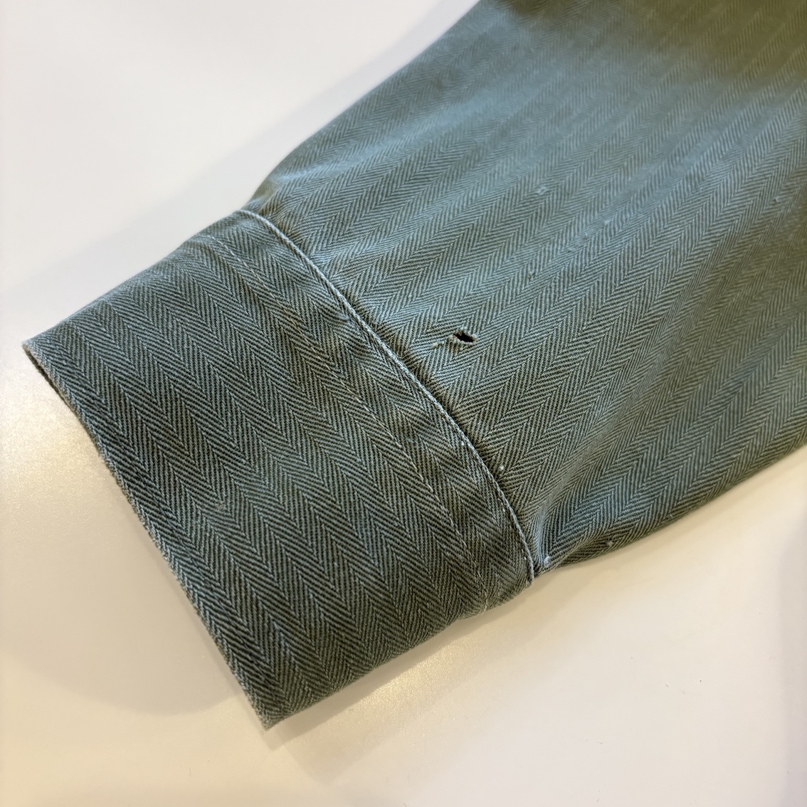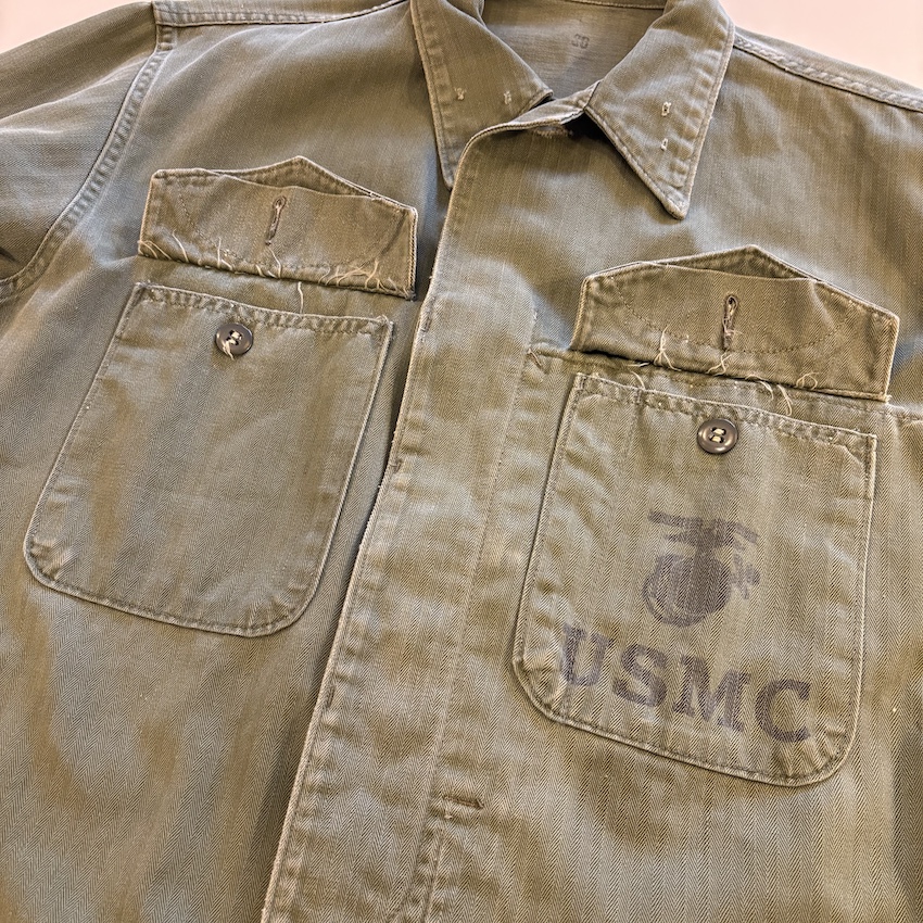 両襟にバッヂ跡、両袖、前後身頃に小穴がありますが、目立つものではなく、着用の支障になるようなものではありません。オリーブの色味はしっかりと残っており、HBTではありがちな両袖の擦り切れもなく、ファティーグボタンも欠品なく揃っています。P53の特徴でもある左身頃内側の大型ポケットや比翼のフロントなど、このモデルならではのディティールを楽しんでいただけます。