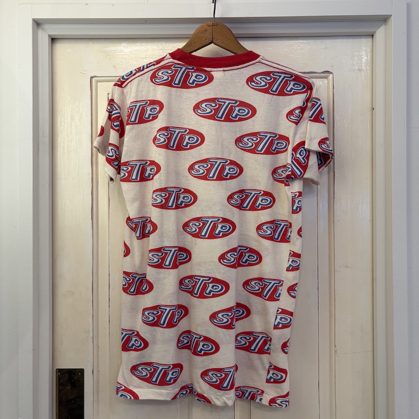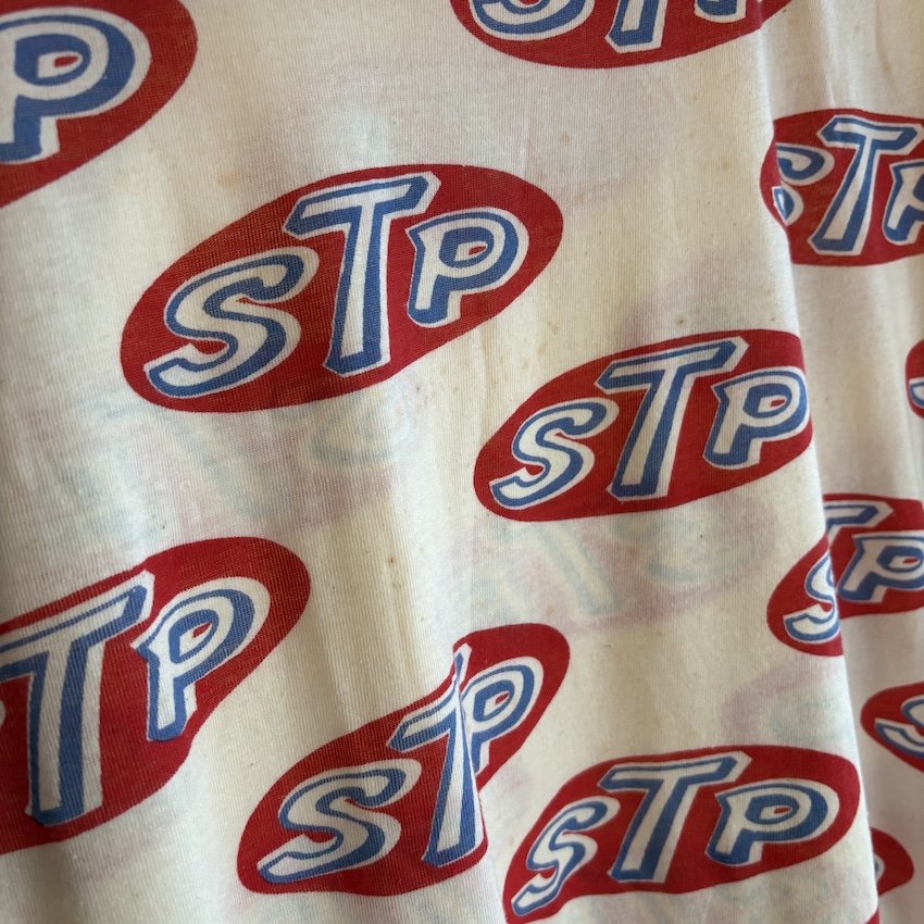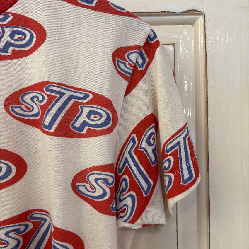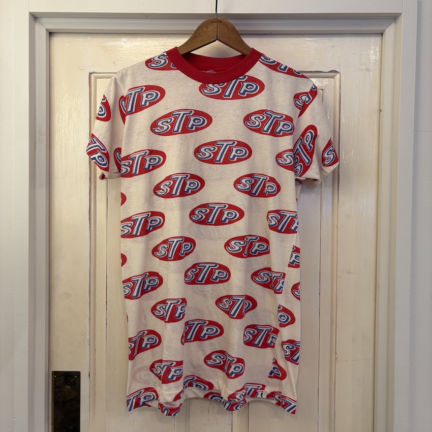 70年代から80年代、STPの総柄Tシャツです。表記サイズM(38-40)。